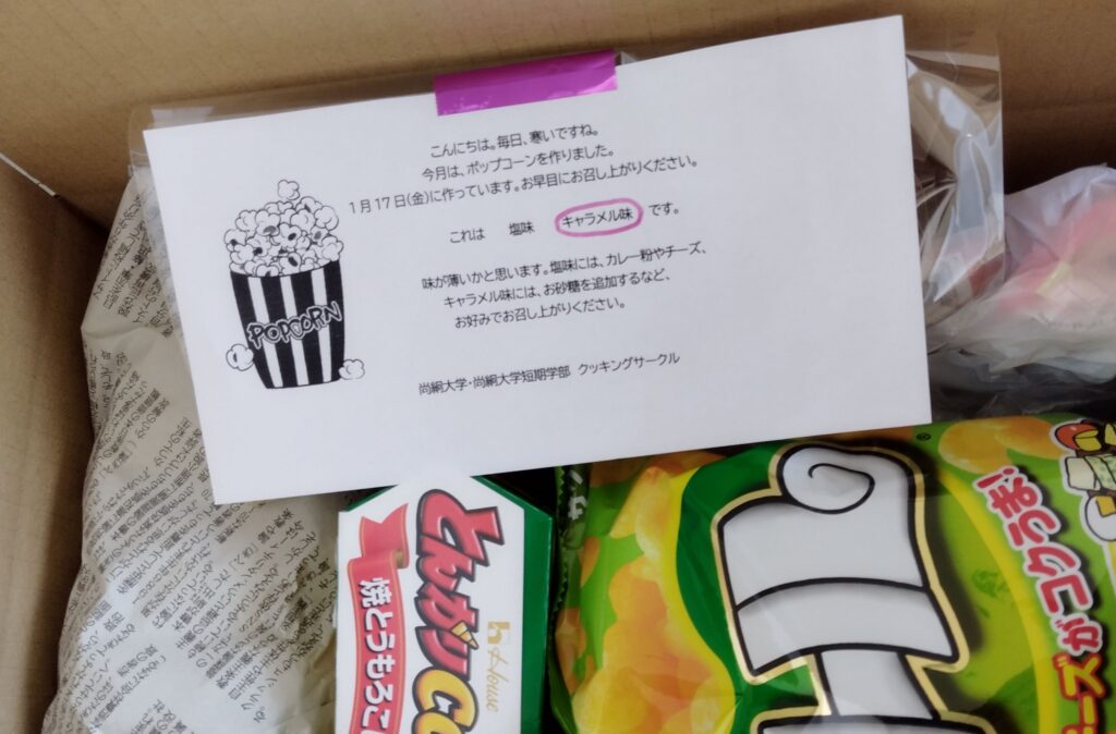 しあわせBOXにと、尚絅大学・尚絅大学短期大学部のクッキングサークルの保育学生さんがポップコーンを作ってくれました!子どもたちは、BOXにお菓子が入っていると大喜びします!