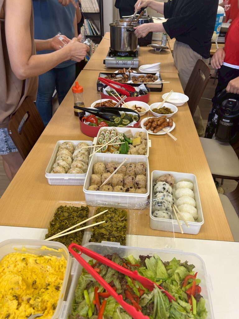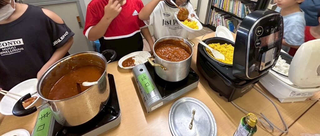 お昼は、恒例のマミさん食堂。山椒のおにぎりや色とりどりのおかず、そして夏の特製カレー!隠し味は、玉ねぎたっぷりだそうです。いつもは子どもに合わせて甘口が多いママたちにと、大人用辛口も用意してくれました。作ってもらえるご飯って、なんでこんなに美味しいんでしょー。みなさんあっという間に平らげましたよ!