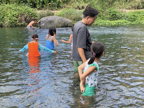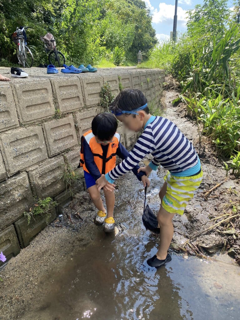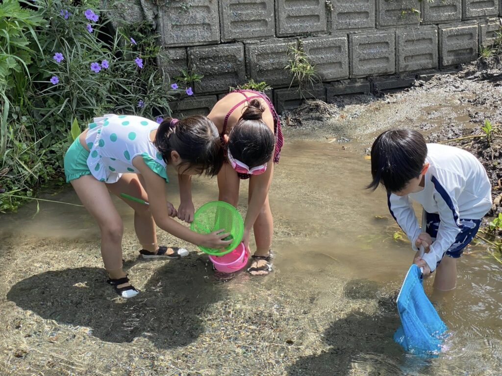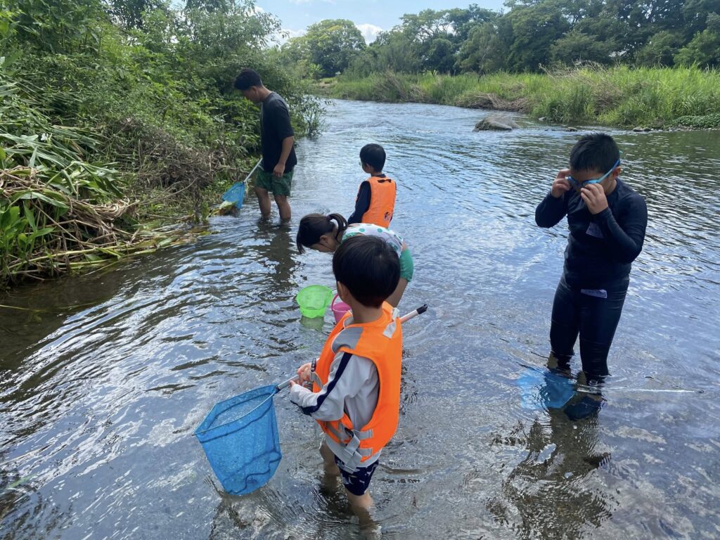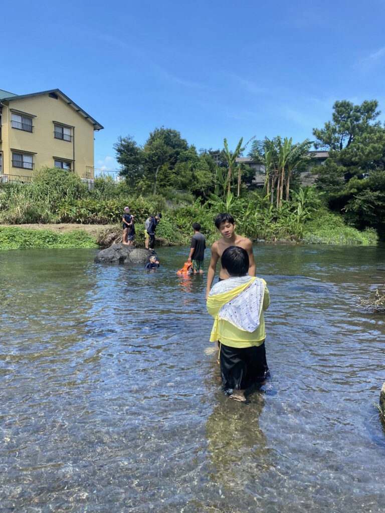 ジャブジャブと芭蕉園を流れる川を歩き、カニや小さな魚を捕まえ、上江津湖の湧水に飛び込んだり、泳いだり、またまたカニを捕ったり、子どもたちも水をえた魚のようにしなやかに水と戯れていました!